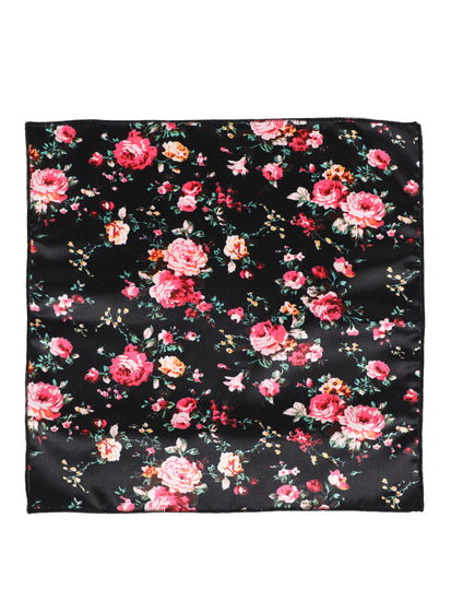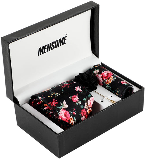 Black Floral Neck Tie, Pocket Square And Lapel Pin Combo Gift Set