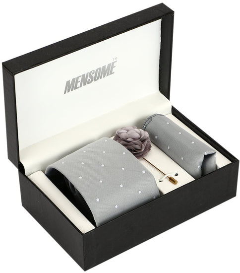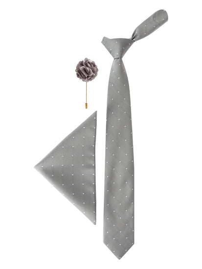 Grey Polka Neck Tie, Pocket Square And Lapel Pin Combo Gift Set