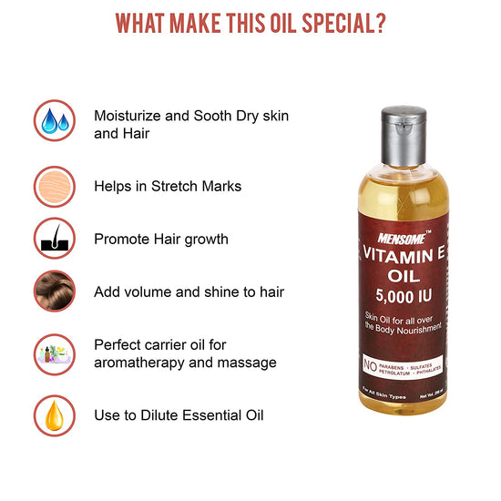 MENSOME Vitamin E oil acts as a moisturizer to prevent or treat dry, flaking skin and adds volume and shine to your glossy hair!